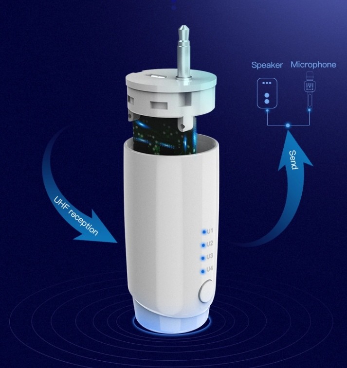В комплекте с микрофоном идёт аудио-трансмиттер, который вынимается их ручки микрофона.